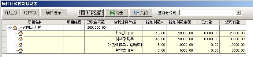 2. 假設【萬達國際大廈】項目,承包合同中累計收款金額為20萬,那么按控制比例得出的結果是:人工費=200000*15%=30000、材料費=2000000*45%=90000、外包機械運輸車輛=10000、其他費=6000,具體資金狀況我們可以在菜單二次開發中打開【項目資金控制狀況表】查看,其中包含了項目控制付款金額(根據上面的公式得出),已付款金額(根據累計付款單得出),還可付款(根據上面兩組數據得出)。