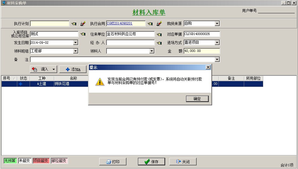 彈出付款申請單,付款名稱自動默認材料設備款+預付款,付款明細是自動帶入的,選擇支付方式點保存,會出現提示窗口根據下面截圖進行選擇繼續。