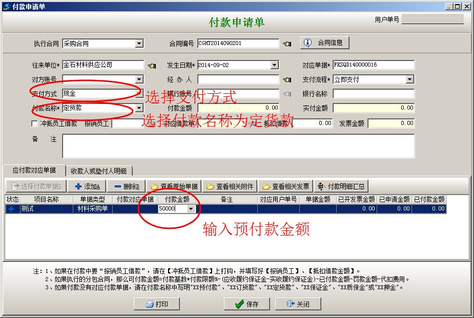 注:因為沒有到貨驗收入庫,所有付款名稱要為:“定貨款”、“訂貨款”、“預支款”、“預付款”,并且要對應好合同編號(系統規定必須有合同才能做預付款或定金等付款)。