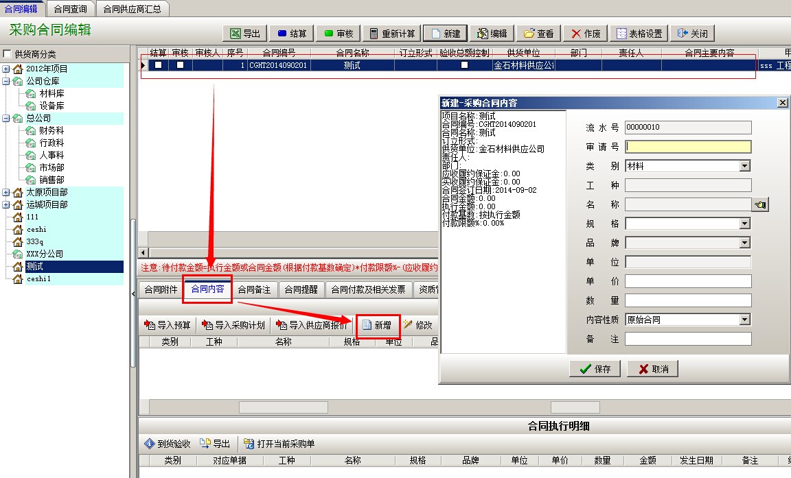 打開采購合同,左側選擇相應的項目,右邊點新建,錄入采購合同相關信息,保存。