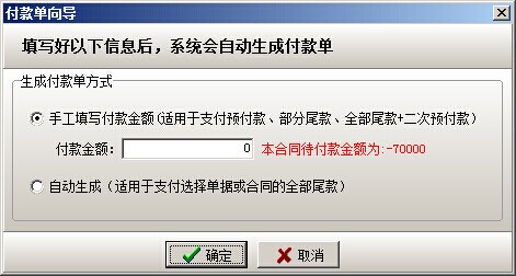在彈出的付款單向導中輸入再次預付款金額,點確定
