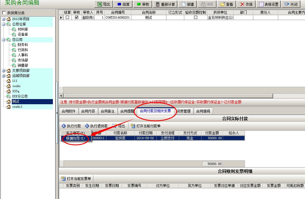如果再有付款的情況,我們做【采購合同】->【合同付款及相關發票】->【到貨驗收】->【合同付款】->【根據向導】。