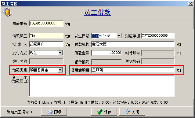 (1)本解決方案基本上和情況二類似,區(qū)別在于員工請款單、員工借款單的[借款類別]要為“項目備用金”,如下圖: