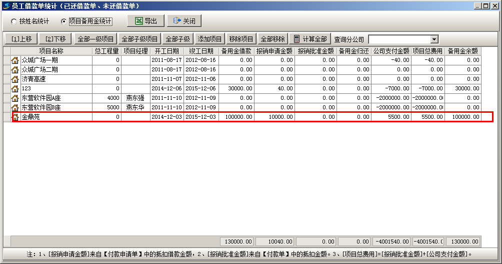 支付完成之后可在“員工借款統(tǒng)計”-“項目備用金統(tǒng)計”查看到對應(yīng)的項目備用金及報銷金額的匯總。