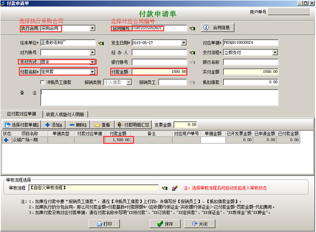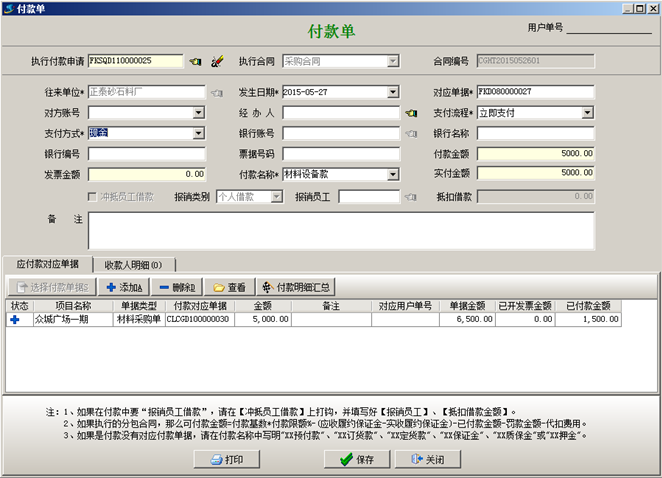在工地現場材料管理過程中,如果工地現場采購大量材料需要簽訂采購合同并在到貨之前付預付款時,我們要在采購合同中,選中對應的采購合同,點擊[合同付款及相關發票],點擊[執行付款]-[手工填寫]彈出“付款申請單”,在“付款申請單”中選擇執行“采購合同”,并選擇對應的“合同編號”,選擇“支付方式”,選擇“付款名稱”為“訂貨款”,并在“付款金額”里面輸入“預付款”金額,“付款申請單”添加完成之后點擊[保存]的按鈕保存單據,如圖: