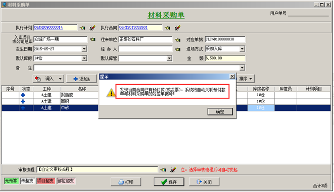 在工地現場材料管理過程中,材料到貨之后,可以做采購入庫單(材料驗收單)執行驗收入庫(或直進項目)。或在“合同內容”里面,點擊[到貨驗收],在彈出“采購入庫單”(材料驗收單),在單據中輸入“驗收數量”,保存時系統會提示自動關聯第一次預付款,“確定”之后保存,如圖:
