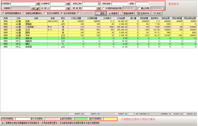 如果要查看材料采購的執行情況,可進入到[采購計劃執行查詢]里面按照查詢條件進行查詢。可根據材料顯示的不同的顏色看出材料的采購計劃執行情況,如圖: