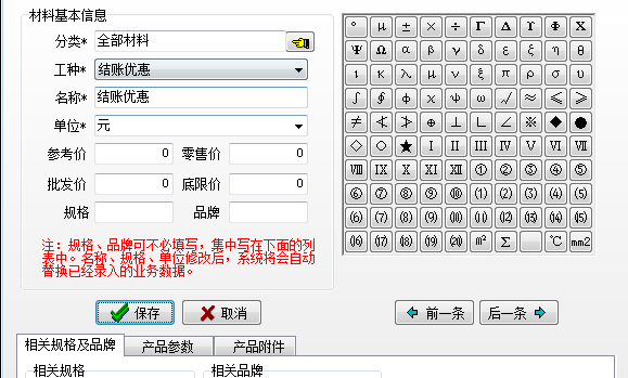 首先在工地項(xiàng)目管理系統(tǒng)中材料維護(hù)新建一個(gè)名稱(chēng)為結(jié)賬優(yōu)惠的虛擬材料,如下圖: