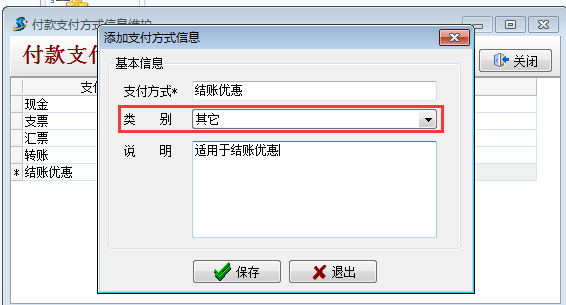 在工地項(xiàng)目管理系統(tǒng)中【財(cái)務(wù)管理】支付方式維護(hù)新建一個(gè)結(jié)賬優(yōu)惠的支付方式,類(lèi)別選擇其它,如下圖