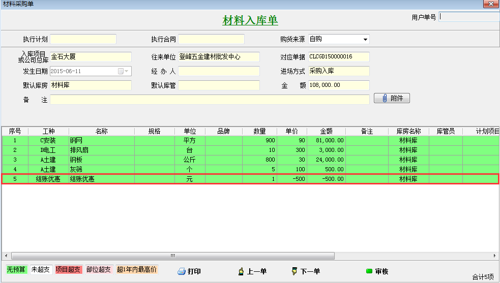 如果有優(yōu)惠金額時(shí),在工地項(xiàng)目管理系統(tǒng)中填寫(xiě)采購(gòu)入庫(kù)單時(shí)添加這個(gè)結(jié)賬優(yōu)惠的虛擬材料,金額為優(yōu)惠金額的負(fù)數(shù)