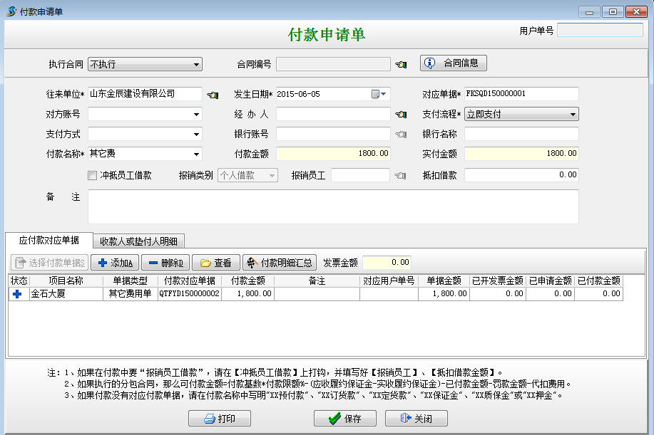 在工程項(xiàng)目資質(zhì)掛靠管理中因?yàn)榻栌靡曳?span style="font-family:Times New Roman;">B的資質(zhì)或者乙方B代開發(fā)票需要向乙方B支付管理費(fèi)和稅金。這時(shí)我們需要做其他費(fèi)用單在做付款申請單或者付款單,具體操作如下: