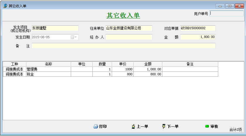 在工程項(xiàng)目資質(zhì)掛靠管理中甲方直接把承包款支付給借資質(zhì)公司(乙方B),我公司不會(huì)跟甲方產(chǎn)生往來賬款。由于是借的我方的資質(zhì),乙方B需要向我公司支付管理費(fèi)或者稅金。通過其它收入單來記錄這筆費(fèi)用。如下圖: