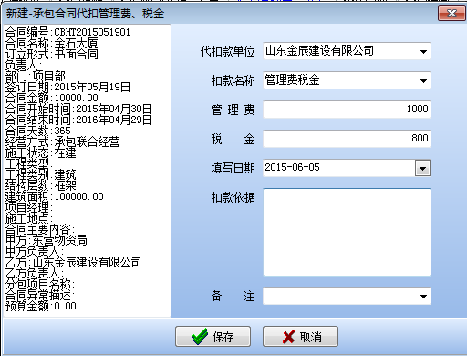 在工程項(xiàng)目資質(zhì)掛靠管理中因?yàn)榻栌靡曳?span style="font-family:Times New Roman;">B的資質(zhì),需要扣除管理費(fèi),如果需要乙方B代開發(fā)票還需要扣除稅金。在承包合同中[代扣管理費(fèi)稅金]模塊下操作,如下圖: