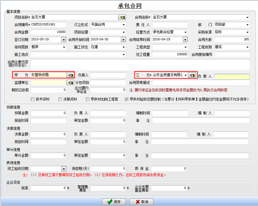 在工程項(xiàng)目資質(zhì)掛靠管理中其他公司借用我公司資質(zhì)主要涉及到的模塊為【承包合同】,【分包合同】,錄入相關(guān)單據(jù)前,需先錄入要用到的基礎(chǔ)信息中的【項(xiàng)目維護(hù)】,【工程類型維護(hù)】,【往來單位維護(hù)】,【分包內(nèi)容維護(hù)】
