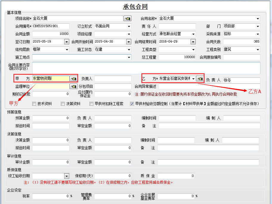 備注:雖然工程款是甲方給的乙方B,乙方B又給的我公司,但是收款單的往來單位是甲方而不是乙方B