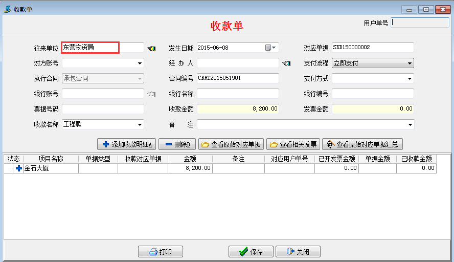 在工程項(xiàng)目資質(zhì)掛靠管理中如果收取工程款直接在[合同收款及相關(guān)發(fā)票]模塊填寫收款單,如下圖