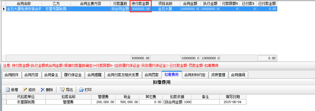 在工程項(xiàng)目資質(zhì)掛靠管理中乙方B借用乙方A的資質(zhì),乙方A需要扣除乙方B管理費(fèi),如果需要乙方A代開發(fā)票還需要扣除稅金。在分包合同中[扣繳費(fèi)用]模塊下操作,如下圖: