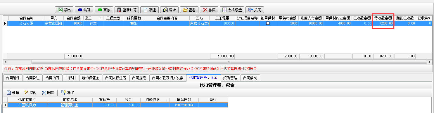 填寫完成【代扣管理費(fèi)稅金】模塊時(shí)待收款金額