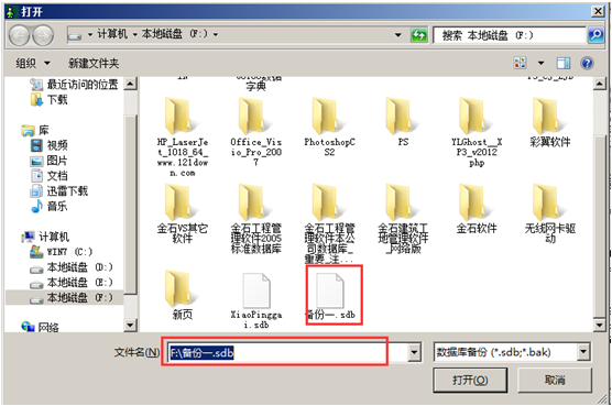 數據還原時,在迷你SQL2000對話框中點擊“還原”的按鈕彈出“打開對話框”,選擇要還原的數據,點擊“打開”,如圖: