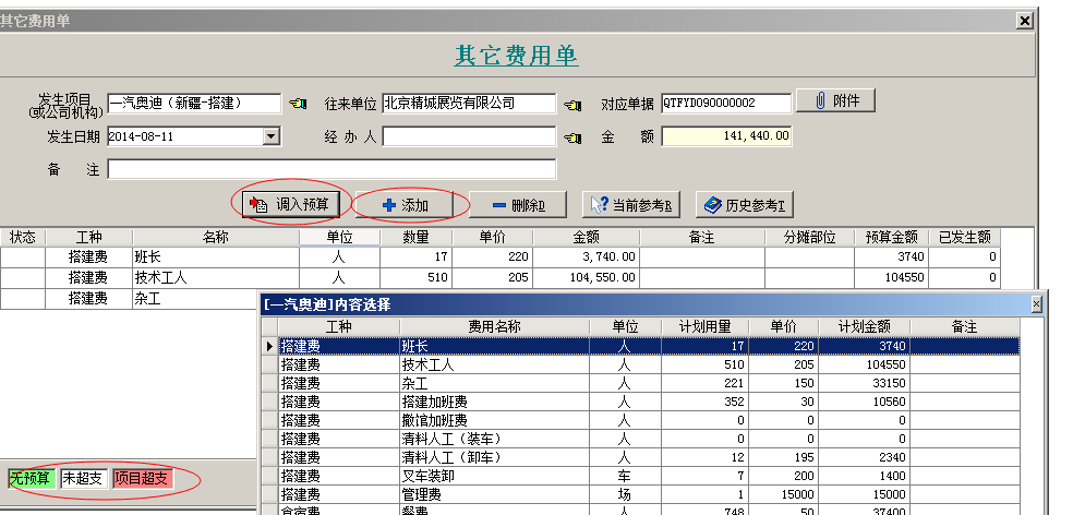 在單據中我們可以使用添加【按鈕】進行添加,也可以使用【調入預算】功能,從預算里面調入。另外在單據中有預警機制,如果添加預算外的內容就明細會顯示綠色,超過預算的就會明細顯示紅色。