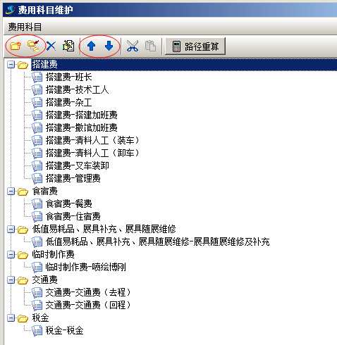 使用左上角圖標按鈕,創建費用科目,第一個按鈕的意思是新建平級科目,第二個按鈕是新建子級科目,按上下的箭頭可以調整上下位置,后面剪刀與文件代表的是復制與粘貼。