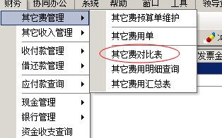 預算與實際對比,在財務菜單中第一項【其他費管理】,【其他費對比表】中查詢。