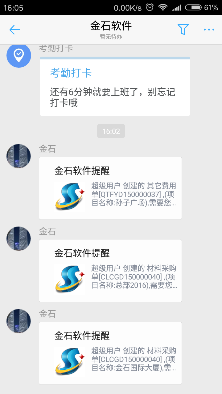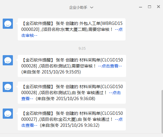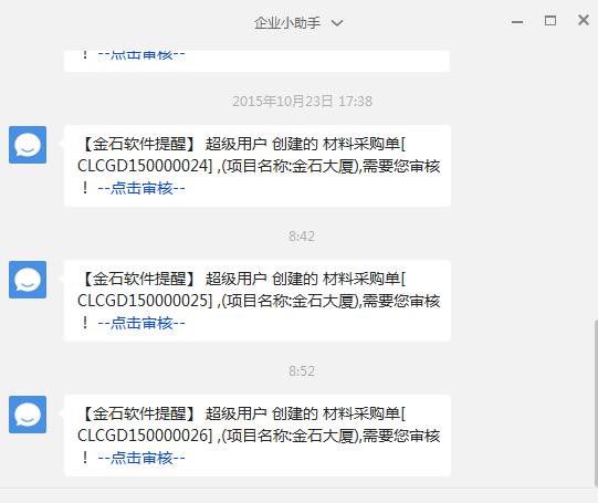 用超級用戶設置好微信認證之后在,當單據(jù)創(chuàng)建人發(fā)起審核后,審核過程中的人都會收到微信提醒信息。微信如下圖: