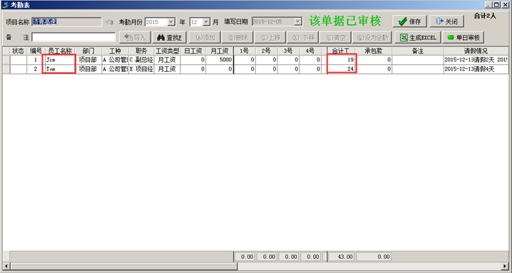 上面定義好公式后,下面我們做了一張考勤單,結(jié)果如下: