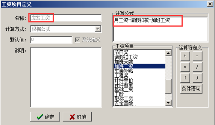 注:若在請(qǐng)假單或加班單中直接手動(dòng)輸入請(qǐng)假扣工資或加班工資,在工資項(xiàng)目定義中直接帶入請(qǐng)假扣工資或加班工資,則無(wú)需定義相關(guān)公式。
