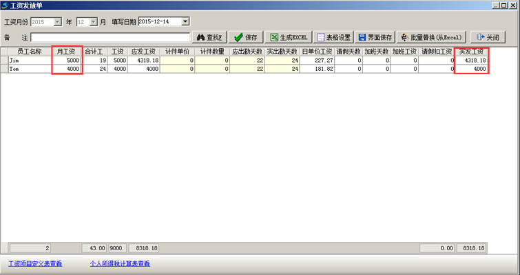 Jim實(shí)發(fā)工資=月工資/應(yīng)出勤天數(shù)*合計(jì)工-扣預(yù)支款+計(jì)件單價(jià)*計(jì)件數(shù)量