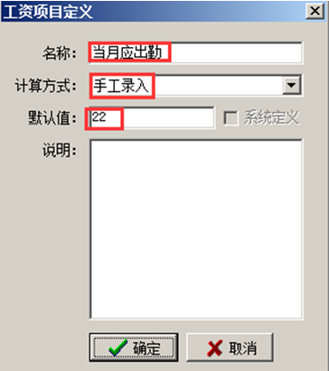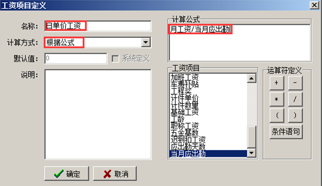 1、先在工資項(xiàng)目定義中增加兩個(gè)科目:日單價(jià)工資,當(dāng)月應(yīng)出勤。如圖: