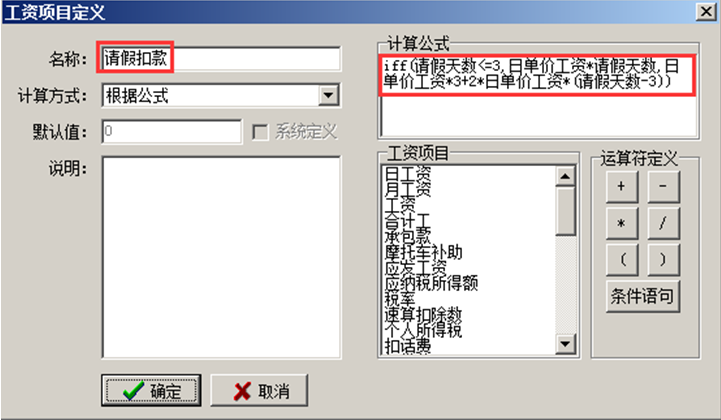 工資項(xiàng)目定義中定義“請(qǐng)假扣款”,如圖:
