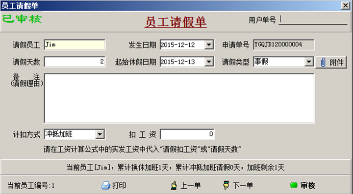 注:“扣工資”金額這里不用填寫,因?yàn)樵诒纠小竟べY項(xiàng)目定義】中“請(qǐng)假扣工資”要通過(guò)公式來(lái)得出。如果,“請(qǐng)假扣工資”不根據(jù)【工資項(xiàng)目定義】公式計(jì)算,每張請(qǐng)假單單獨(dú)體現(xiàn)的話,這里需要填寫好“扣工資”金額。