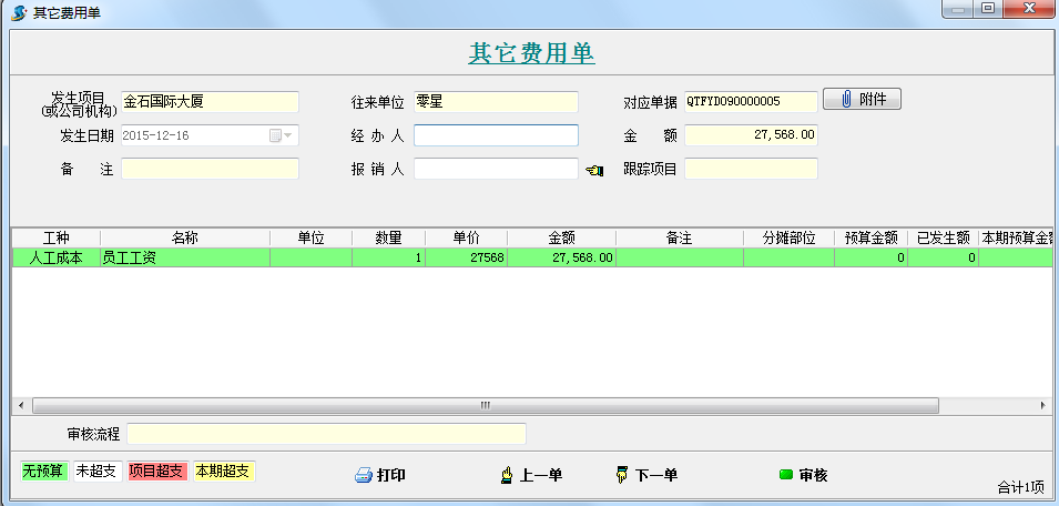 使用工程管理軟件【財務管理】-【其他費用單】記錄員工工資合計,詳細的excel工資表可導入到其他費用單單據附件中。如下圖: