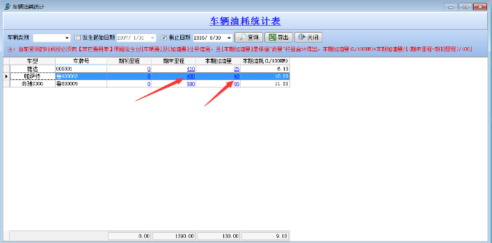 注:當(dāng)前查詢的時間段必須有【其他費用單】明細(xì)發(fā)生過[車輛]及[加油費]業(yè)務(wù)信息,且[本期加油量]是根據(jù)“數(shù)量”欄目合計得出,本期加油量(L/100KM)=本期加油量/[(期末里程—期初里程)/100]