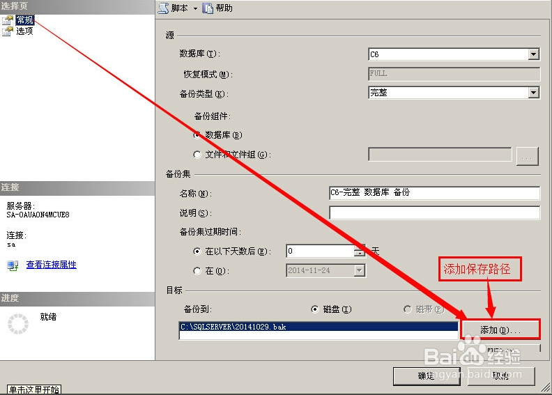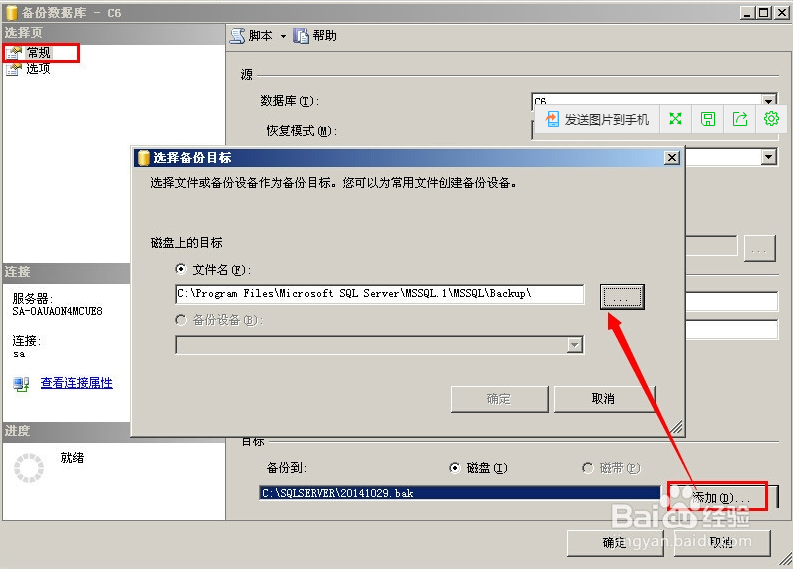4、彈出備份數據庫窗口,在常規中設置保存路徑,步驟為首先點擊左邊的常規,然后點擊添加,在彈出框中點擊省略號選擇文件的保存,后綴名稱為.bak,填寫完成之后,點擊確定