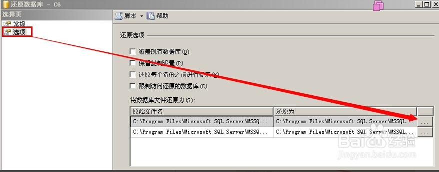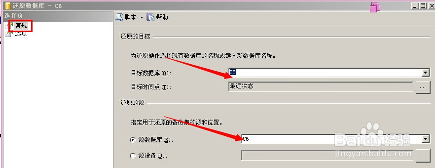 6、彈出還原數據庫窗口,在常規中檢查目標數據庫名稱與源數據庫名稱是否正確、在選項中找到備份的數據庫文件