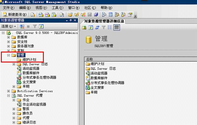 3、在【對象資源管理器】窗口里選擇【管理】——【維護計劃】選項。