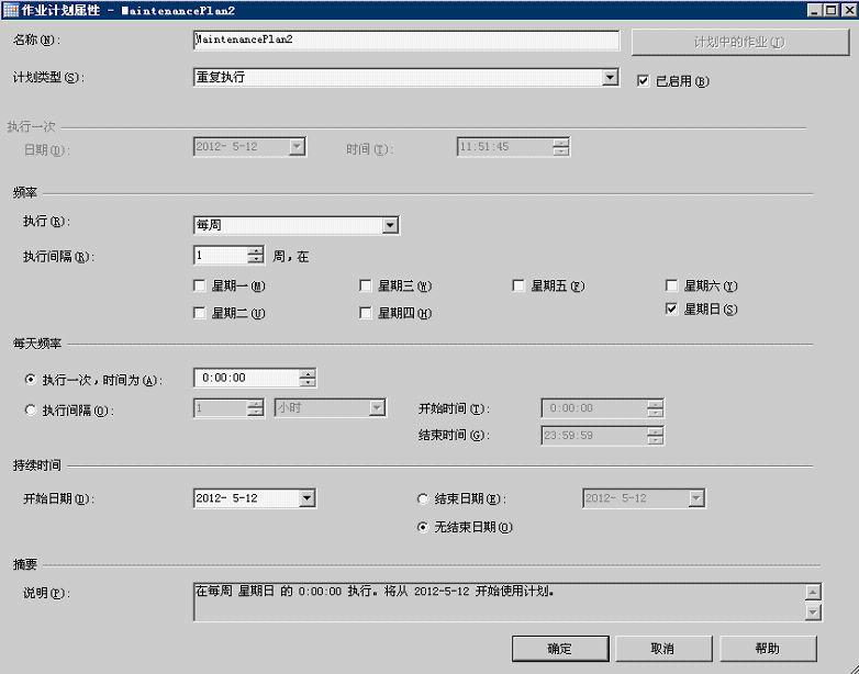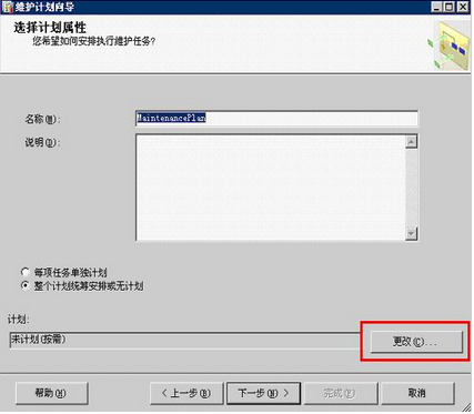 點擊【更改】按鈕,彈出如圖所示【計劃作業屬性】對話框。在該對話框里可以設置備份數據庫的時間及頻率,設置完畢后單擊【確定】按鈕回到【選擇計劃屬性】窗口,再單擊【下一步】按鈕。