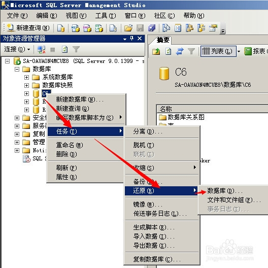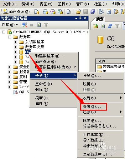 5、備份完成之后,如果有需要還原的需求的話,可以右擊數據庫名,然后鼠標移動到任務,選中還原,最后點擊數據庫