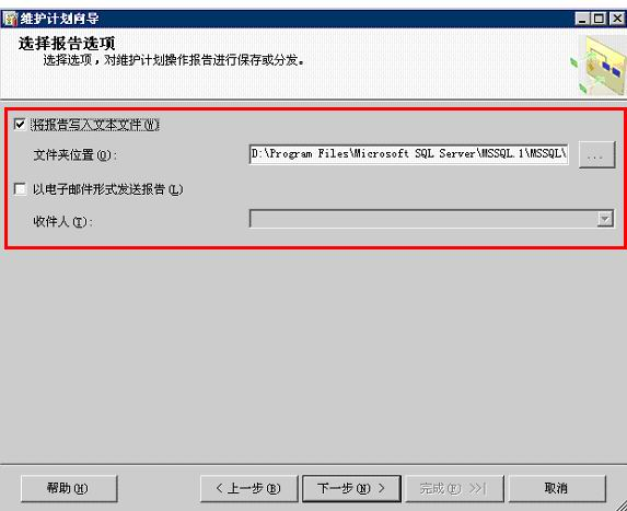 10、彈出【選擇報告選項】對話框,在該對話框里可以選擇如何管理維護計劃報告:可以將報告寫入文件中,或通過電子郵件發送數據庫管理員。設置完畢后單擊【下一步】按鈕。