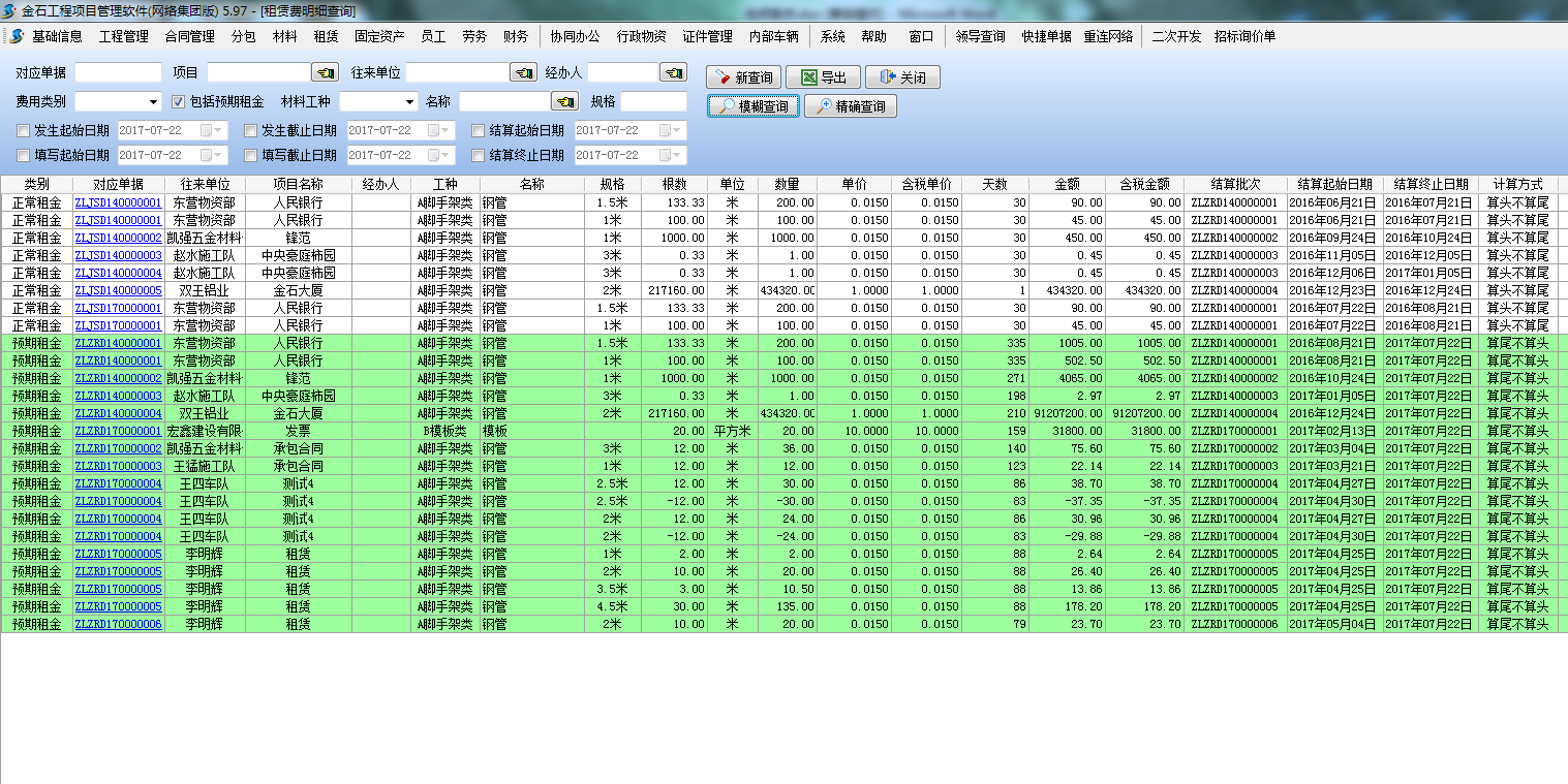 在租賃管理方便,經(jīng)常租一些周轉(zhuǎn)材料,跟租賃公司都是長期合作,結(jié)算方式都是采用季度結(jié)算或者年度結(jié)算,之前采用紙質(zhì)或者excel統(tǒng)計(jì),統(tǒng)計(jì)并不準(zhǔn)確,到季度或者年度結(jié)算時(shí)往往統(tǒng)計(jì)不準(zhǔn)確,都是按照供應(yīng)商提供數(shù)據(jù)進(jìn)行結(jié)算,具體租賃費(fèi)并沒有參考依據(jù)。采用金石項(xiàng)目管理軟件后,可以實(shí)時(shí)查看租賃情況,統(tǒng)計(jì)租賃庫存,并且最后結(jié)算時(shí)選好結(jié)算批次可以自動(dòng)計(jì)算結(jié)算租金。在租賃過程中并可以實(shí)時(shí)查看預(yù)期租金,評(píng)估預(yù)期成本。采用采用金石項(xiàng)目管理軟件后租金統(tǒng)計(jì)準(zhǔn)確,對(duì)后期結(jié)算產(chǎn)生了很大的幫助。