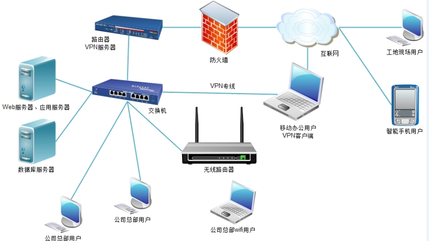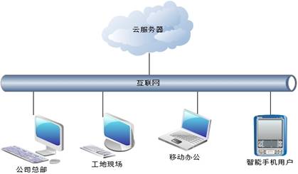 普通版,適用于操作員在公司總部辦公為主的公司,服務(wù)器架設(shè)在公司總部,工作總部工作人員可通過公司部署的局域網(wǎng)訪問服務(wù)器,工地現(xiàn)場(chǎng)及移動(dòng)辦公用戶采用互聯(lián)網(wǎng)訪問的方法使用軟件,為了訪問穩(wěn)定及數(shù)據(jù)安全可以在公司總部架設(shè)vpn 或域名解析軟件,廣域網(wǎng)操作用戶采用vpn撥號(hào)、或域名訪問的連接的方式連入公司局域網(wǎng)內(nèi)。