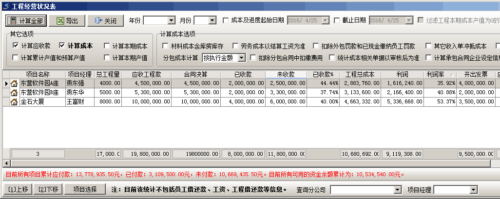 可查詢出項(xiàng)目(包括所有項(xiàng)目、某一子公司的項(xiàng)目、某資質(zhì)承接的項(xiàng)目、某項(xiàng)目經(jīng)理承包的項(xiàng)目、某開工年度的項(xiàng)目)結(jié)算進(jìn)度、應(yīng)收工程款、已收款、未收款、工程總成本、完成產(chǎn)值、利潤(rùn)、開出發(fā)票、收到發(fā)票等信息,并統(tǒng)計(jì)出目前可用資金余額。
