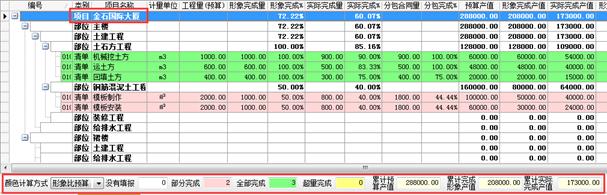 對(duì)于某些工程,高水平的項(xiàng)目經(jīng)理可以把實(shí)際完成量做小,需要的達(dá)到的效果是“實(shí)際干的進(jìn)度小于向甲方上報(bào)的進(jìn)度”。在金石軟件中能很好地體現(xiàn)“實(shí)際進(jìn)度”、“形象進(jìn)度”兩個(gè)概念,在進(jìn)度填報(bào)過程中可以將“實(shí)際進(jìn)度”、“形象進(jìn)度”分別填報(bào)。并且將清單“甲方合同量”、“分包合同量”、“形象完成量”、“實(shí)際完成量”四者的關(guān)系完全展現(xiàn)在一起。