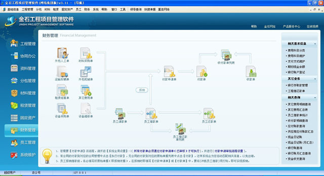 本軟件是金石軟件公司以眾多施工企業(yè)管理現(xiàn)狀為出發(fā)點(diǎn),深入了解施工現(xiàn)場(chǎng),經(jīng)過七年地不斷完善與努力,打造成為一款成熟、靈活、實(shí)用性極高的信息化內(nèi)控管理平臺(tái)。軟件以成本控制為核心,以資金管理為主線,全面解決項(xiàng)目管理難題,提升項(xiàng)目管控能力。對(duì)工程的投標(biāo)管理、中標(biāo)后的進(jìn)度管理、分包管理、采購招標(biāo)、材料管理、租賃管理、固定資產(chǎn)管理、員工管理、勞務(wù)管理、資金管理、押金管理、發(fā)票管理、稅金核算、聯(lián)營(yíng)管理、文檔資料管理、物資管理、安全質(zhì)量管理、證件管理、車輛管理、工程結(jié)算、等進(jìn)行全方位管理,并提供強(qiáng)大的OA功能,能夠?qū)崿F(xiàn)各部門之間的數(shù)據(jù)共享及業(yè)務(wù)單據(jù)網(wǎng)上簽批審核。并且提供了強(qiáng)大的自定義工作流驅(qū)動(dòng)和各種流程開關(guān),企業(yè)可根據(jù)自己情況自行設(shè)定,從而規(guī)范企業(yè)管理、讓工作流程正歸化、簡(jiǎn)單化。通過工作流,讓信息送審、審批更貼近日常公司管理模式,申請(qǐng)人可隨時(shí)看到當(dāng)前業(yè)務(wù)的審批進(jìn)度和各領(lǐng)導(dǎo)的審批意見。