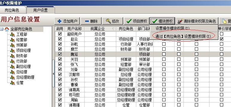 回到用戶設(shè)置模塊,選中要授權(quán)的用戶后點擊【模塊授權(quán)】,選第二項【通過崗位角色設(shè)置模塊權(quán)限】來對操作用戶設(shè)置崗位權(quán)限。