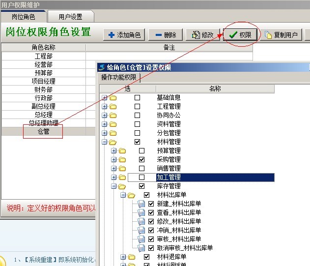 保存之后 ,選擇該崗位,再來設(shè)置這個崗位角色的【權(quán)限】。