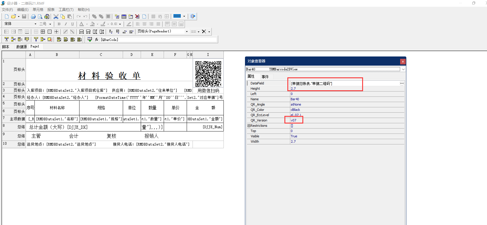 3、設(shè)置好二維碼樣式之后右鍵點(diǎn)擊單元格,點(diǎn)擊屬性。設(shè)置字符來(lái)源(datafield)為“[單據(jù)總賬表."單據(jù)二維碼"]”,二維碼版本(QR_vesion)為:v07