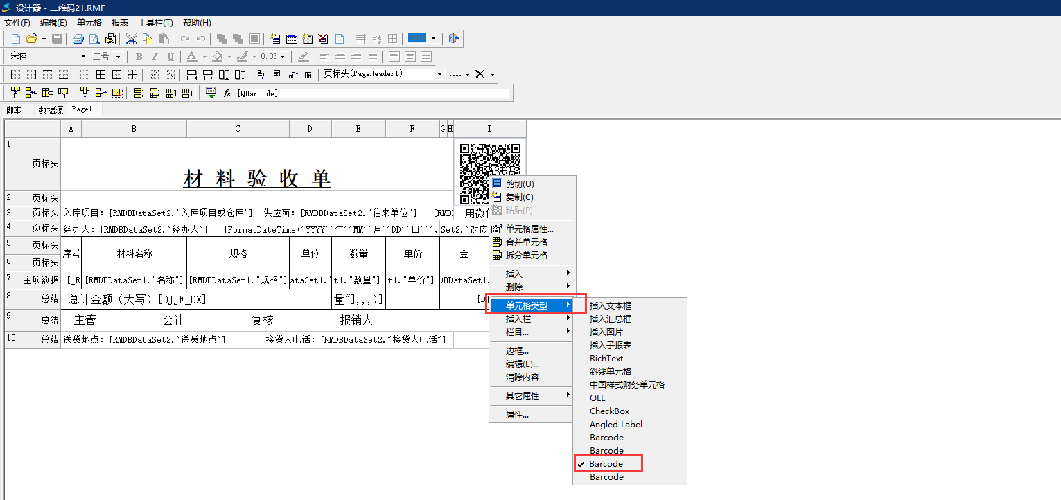 2、設(shè)置二維碼顯示位置及數(shù)據(jù)源。根據(jù)報(bào)表選定二維碼顯示位置,右鍵點(diǎn)擊單元格,選擇單元格類型為Barcode,如圖: